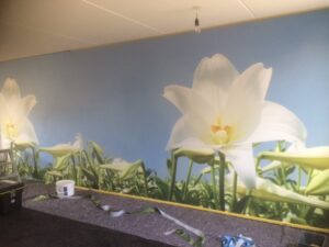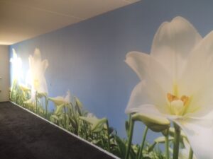 Met naadloos behang breng je elke gewenste sfeer naar binnen: van een luchtfoto van je bedrijf tot een zonnig tropisch eiland, je vertrouwde stad, een weelderige plantenwand of je team in actie.